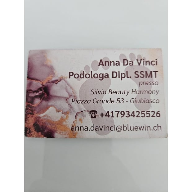 Mi chiamo Anna Da Vinci, Podologa diplomata SSMT, ricevo presso il salone "Estetica Silvia" a Giubiasco e mi occupo della cura dei piedi e della prevenzione di eventuali patologie.